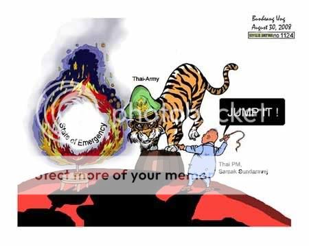 ตูนชิ้นใหม่ลงวันที่ 30 ส.ค.2551 ที่ใช้ชื่อว่า “ละครสัตว์ไทย” (Thai Circus) ได้วาดรูปเสือสวมหมวกทหารสีเขียวสด และเขียนข้อความกำกับเอาไว้ว่า “กองทัพบกไทย” ส่วนครูฝึกเขียนที่ถือแส้ในท่าเตรียมโบยเขียนกำกับเอาไว้เป็น “ไอ้จมูกหมู ปากหมา” ซึ่งได้ออกคำสั่งว่า “กระโดดสิ” (Jump It)