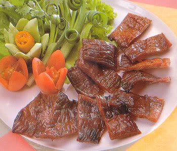 เนื้อวัว 5 ขีด (ควรใช้เนื้อสันในหรือเนื้อสะโพก)วิธีทำ : นำเนื้อที่เตรียมไว้มาแล่บางๆ แล้วนำเกลือ น้ำตาลมาโขลกจนละเอียดแล้วนำมาโรยบนเนื้อให้ทั่วทั้ง 2 ด้าน เสร็จแล้วนำน้ำปลา น้ำมันพืชมาหมักในเนื้ออีกประมาณครึ่งชั่วโมง จากนั้นนำมาผึ่งแดดให้หมาด 1-2 แดด แล้วนำไปเก็บในที่โปร่งหรือในตู้เย็นก็ได้แต่ต้องเก็บให้แห้ง เวลาจะทอดก็นำไปหั่นเป็นชิ้นขนาดพอดีคำ ทอดในกระทะที่มีน้ำมันพอสมควรโดยใช้ไฟปานกลางค่อนข้างอ่อน แต่อย่าทอดนานเดี๋ยวจะเหนียวเกินพอดีไป สำหรับใครที่ไม่ทานเนื้อก็สามารถดัดแปลงเป็นเนื้อหมูได้จ้า ...